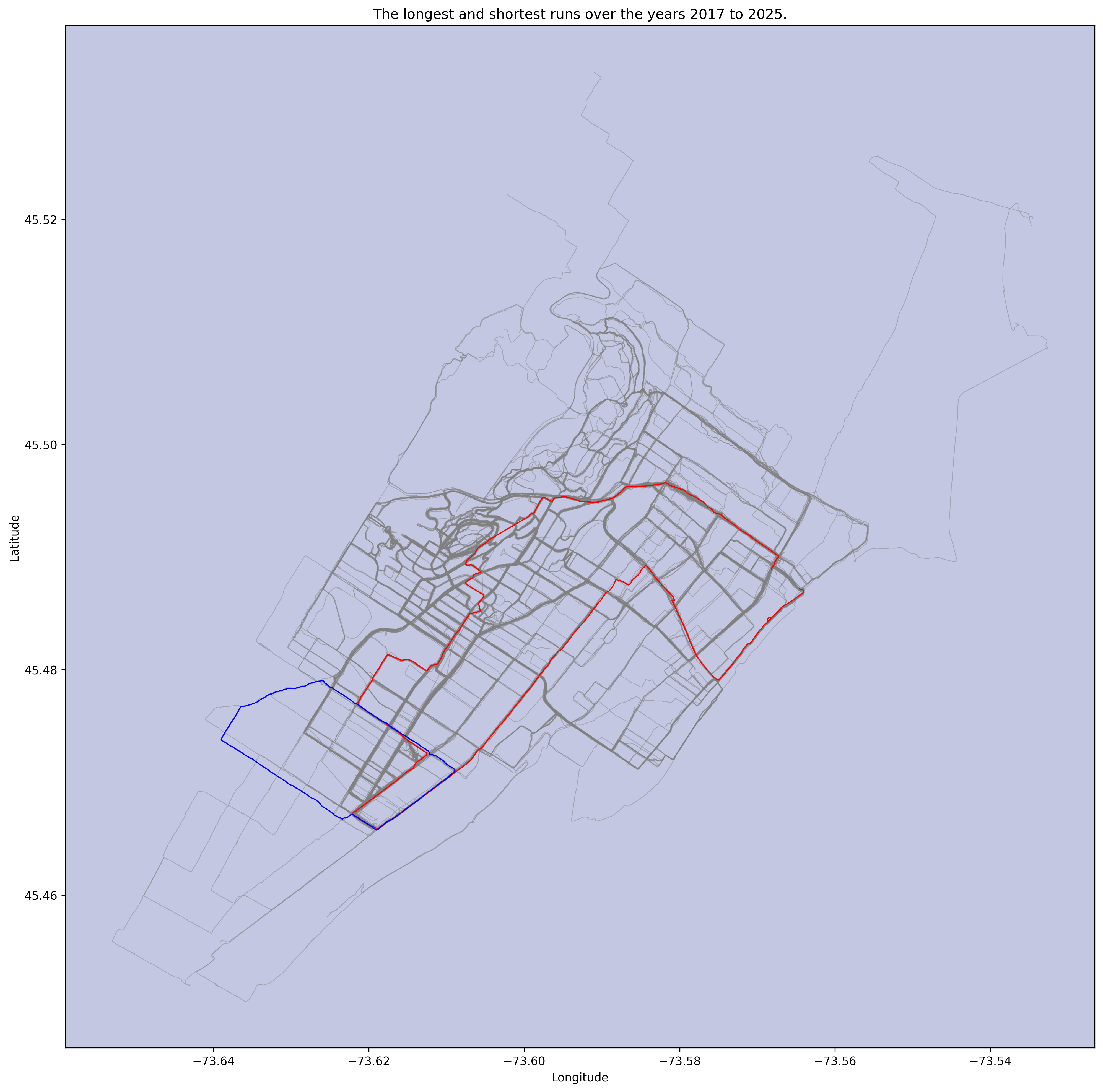 The graph below hightlights in red and blue the longest and shortest runs of the run club. We can see that the shortest one was when the club was starting its run from NDG, and the longest one (as of today middle of September 2025) was starting from the actual meeting point at Espace Ciele. The shortest one was probably a very flat run looking at the path followed avoiding Summit Circle or the St-Joseph oratoire.